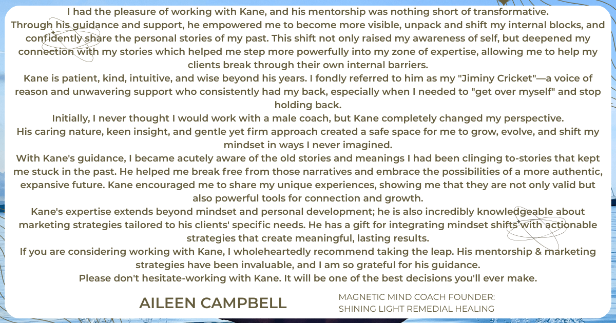 Kane's expertise extends beyond mindset and personal development; he is also incredibly knowledgeable about marketing strategies tailored to his clients' specific needs. He has a gift for integrating mindset shifts with actionable strategies that create meaningful, lasting results.